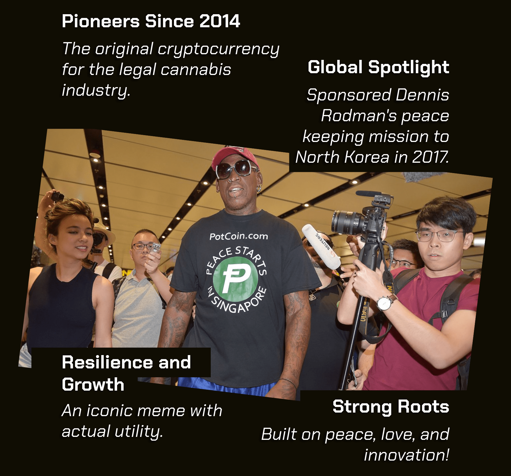 Created by a group of visionary developers in Canada, PotCoin emerged as one of the most popular meme coins representing peace and love. Over the years PotCoin gained a loyal community and garnered global attention in 2017 when it sponsored Dennis Rodman’s Peacekeeping trip to North Korea.